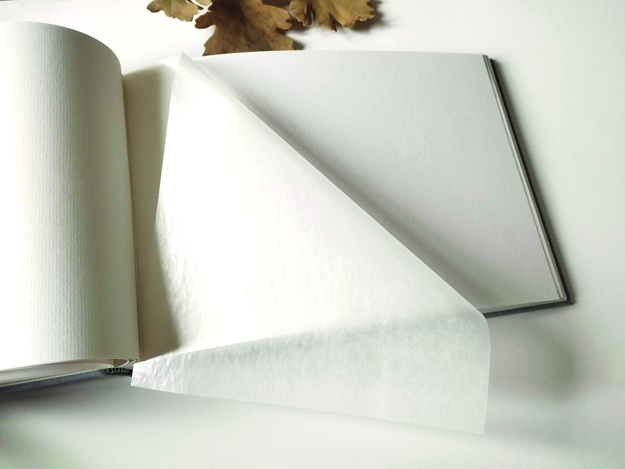 Además, para que puedas poner fotos en los dos lados de la hoja y no se peguen las fotos entre sí al cerrar el álbum, añadimos una hoja de papel cristal entre cada hoja.
