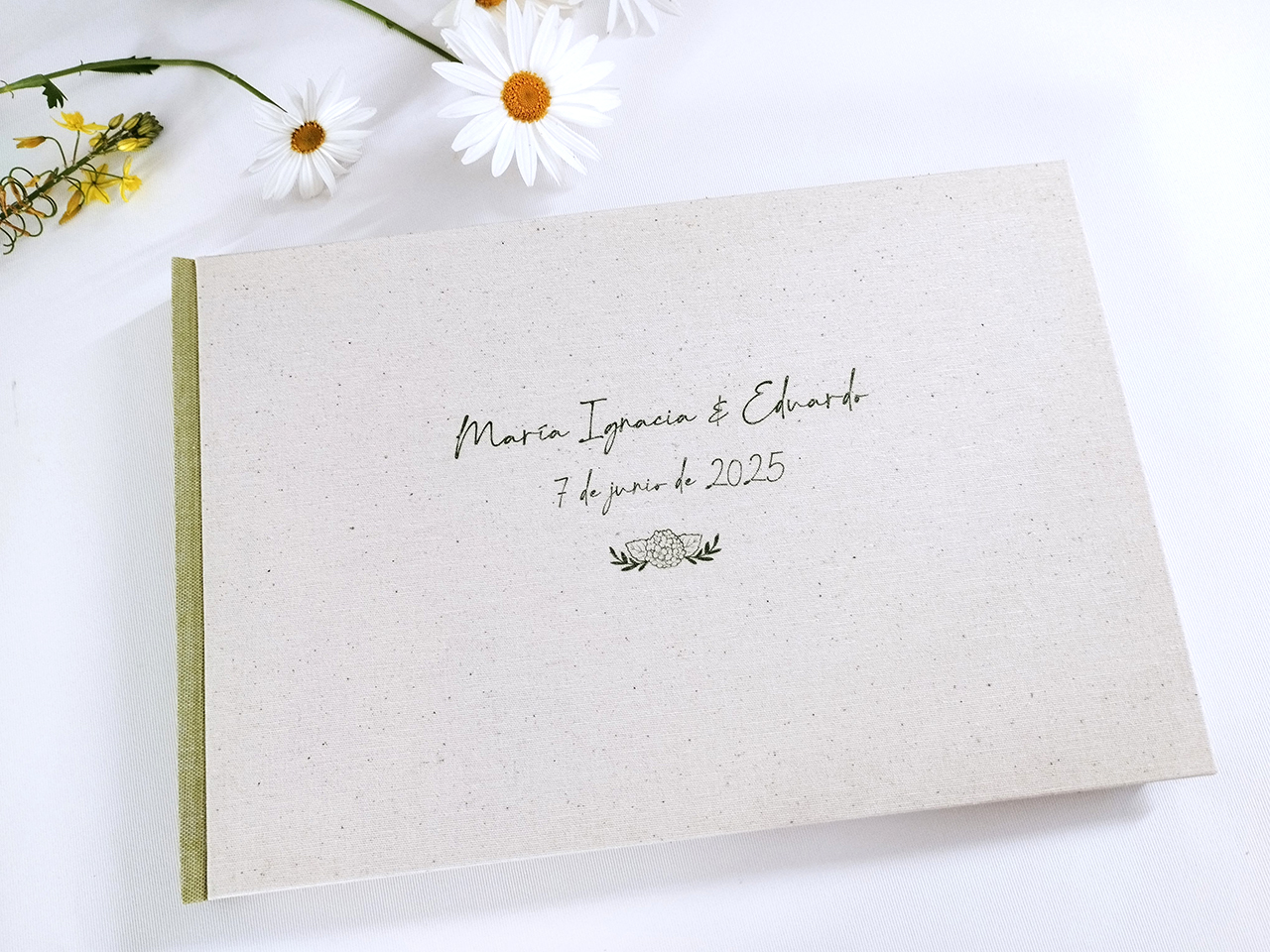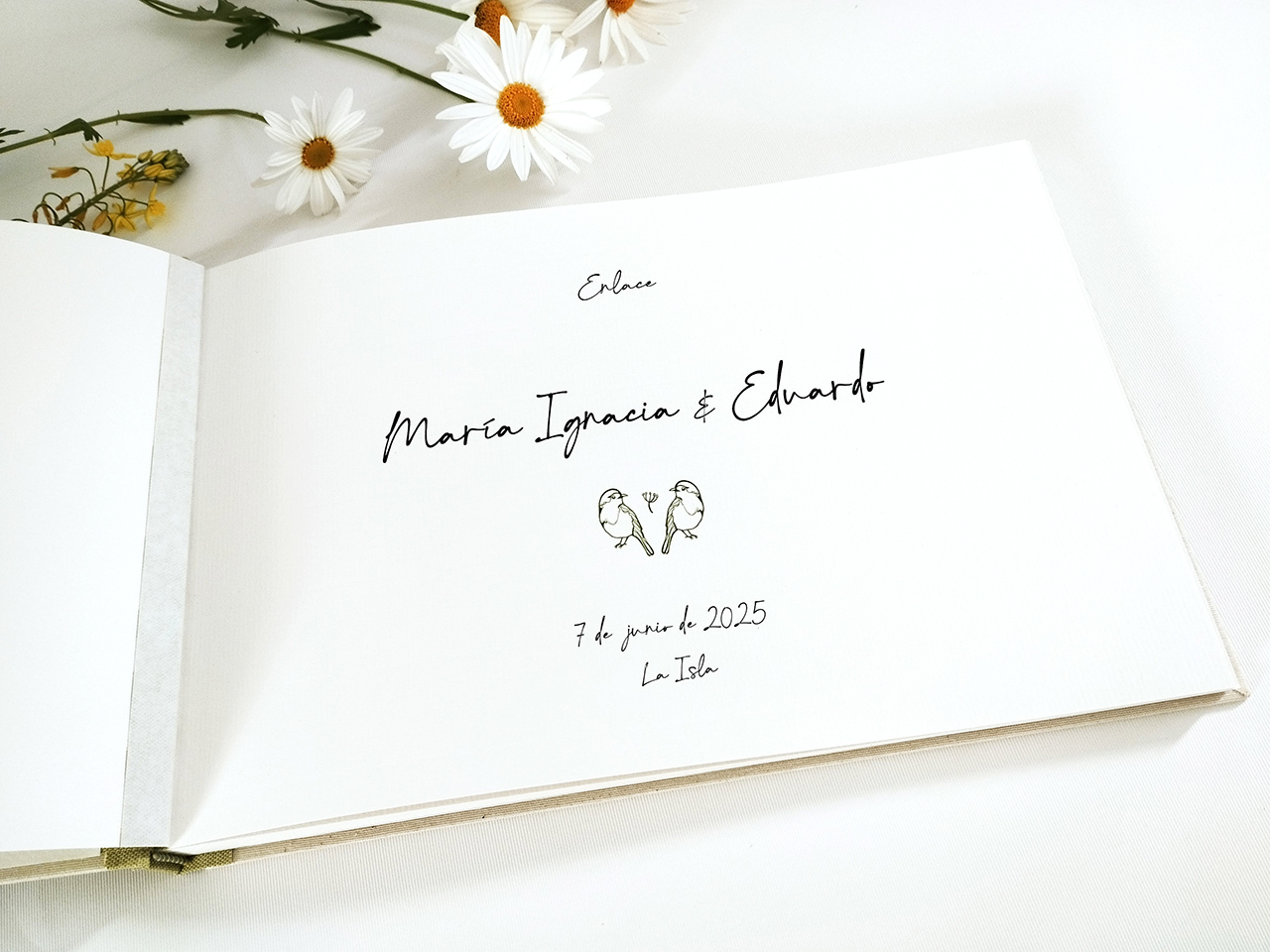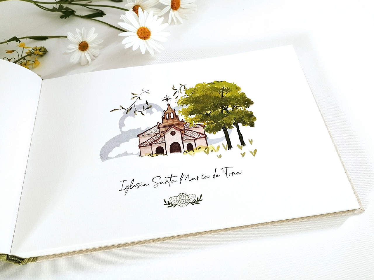 Este álbum tiene dos partes; -La primera parte lleva toda la información de libro de testigos, con todos los nombres impresos y páginas extras que quieras incluir, como dedicatorias, lecturas de la boda, imagen de la iglesia, etc... Incluyendo también las personalizaciones extra, como las guardas personalizadas y la acuarela original de la iglesia o del lugar de la celebración.