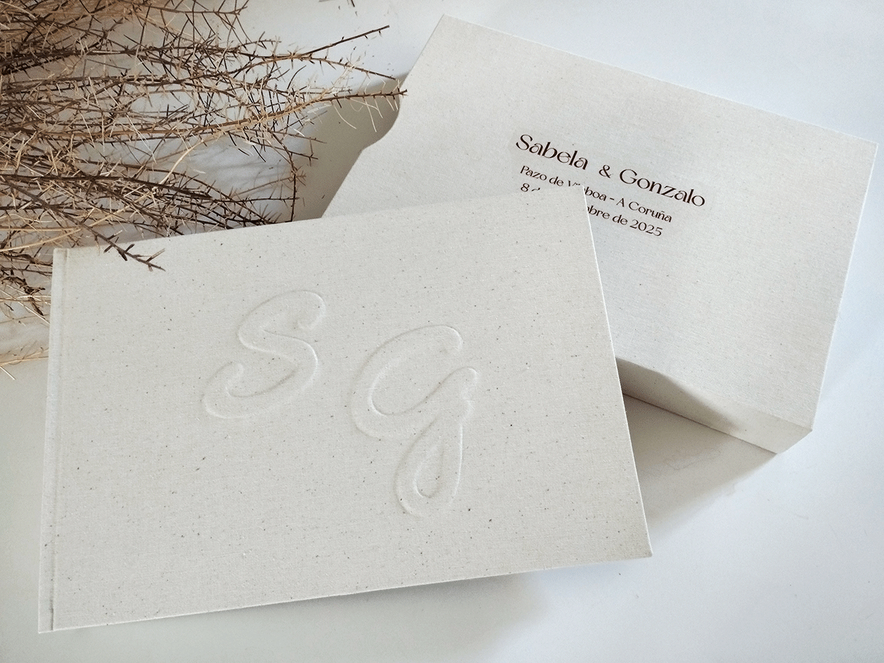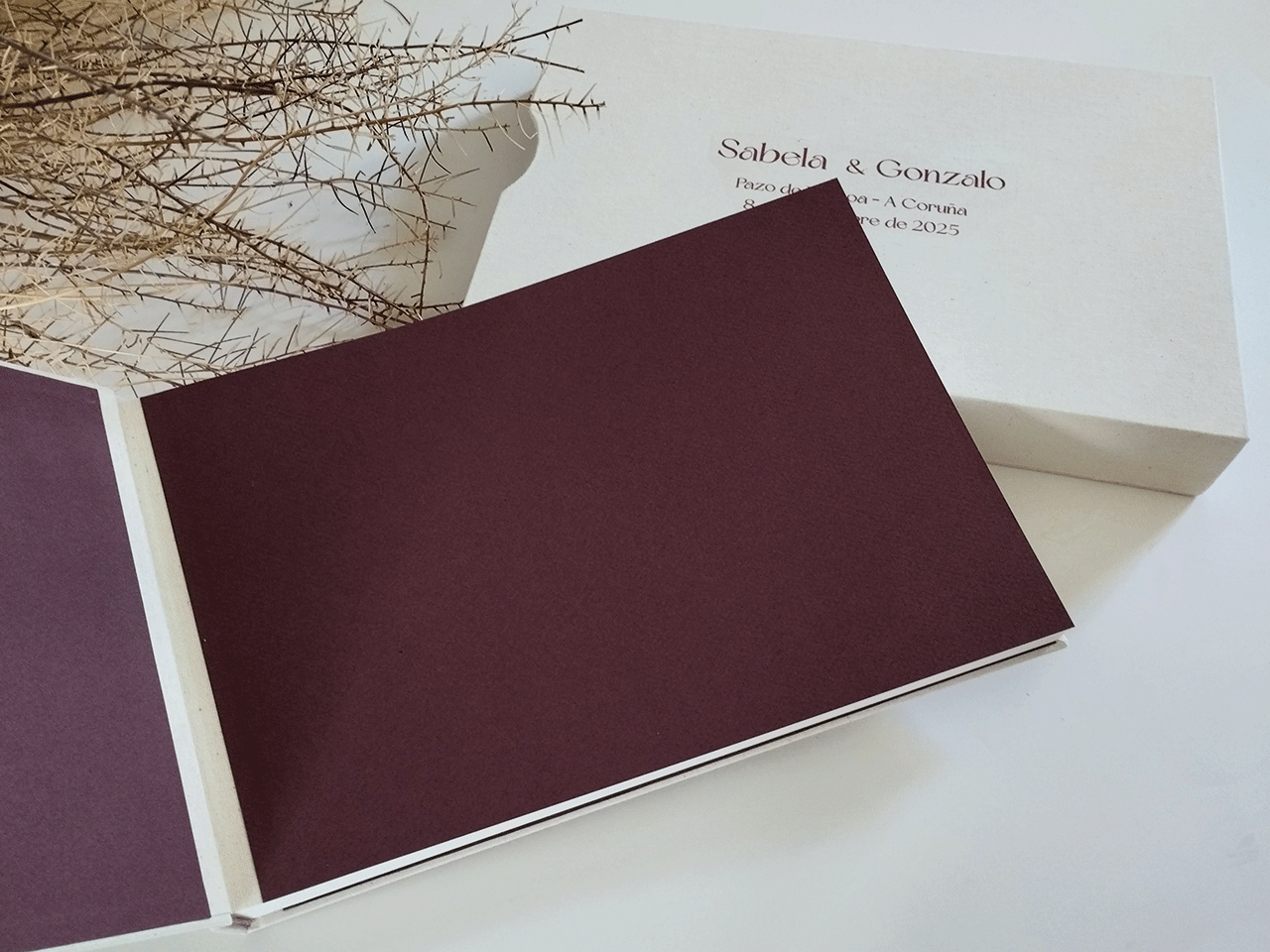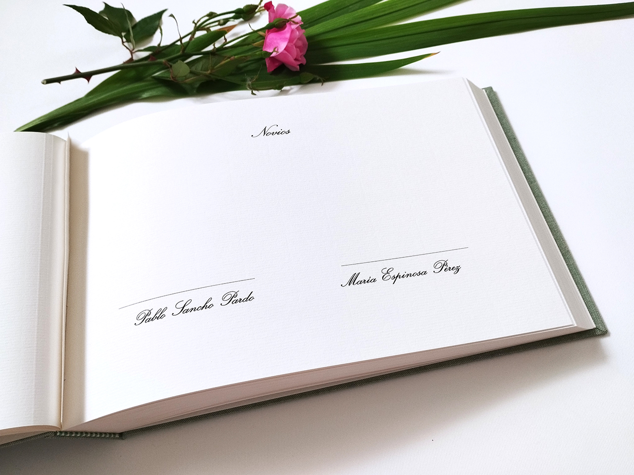 El papel que utilizamos es Conqueror verjurado de 120 grs para la parte de testigos y el mismo papel pero de 250 grs para las hojas de álbum de fotos