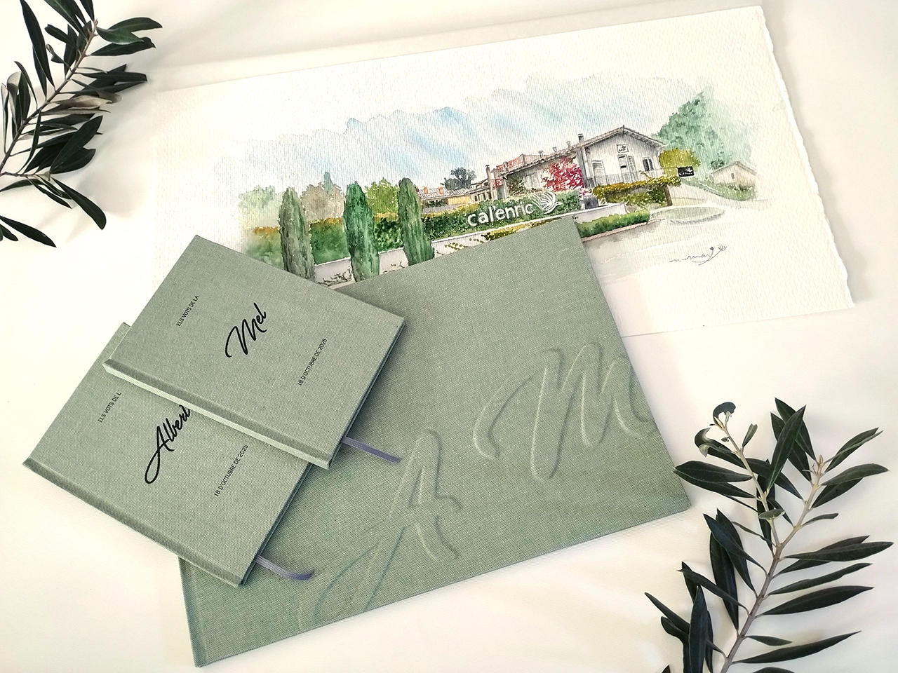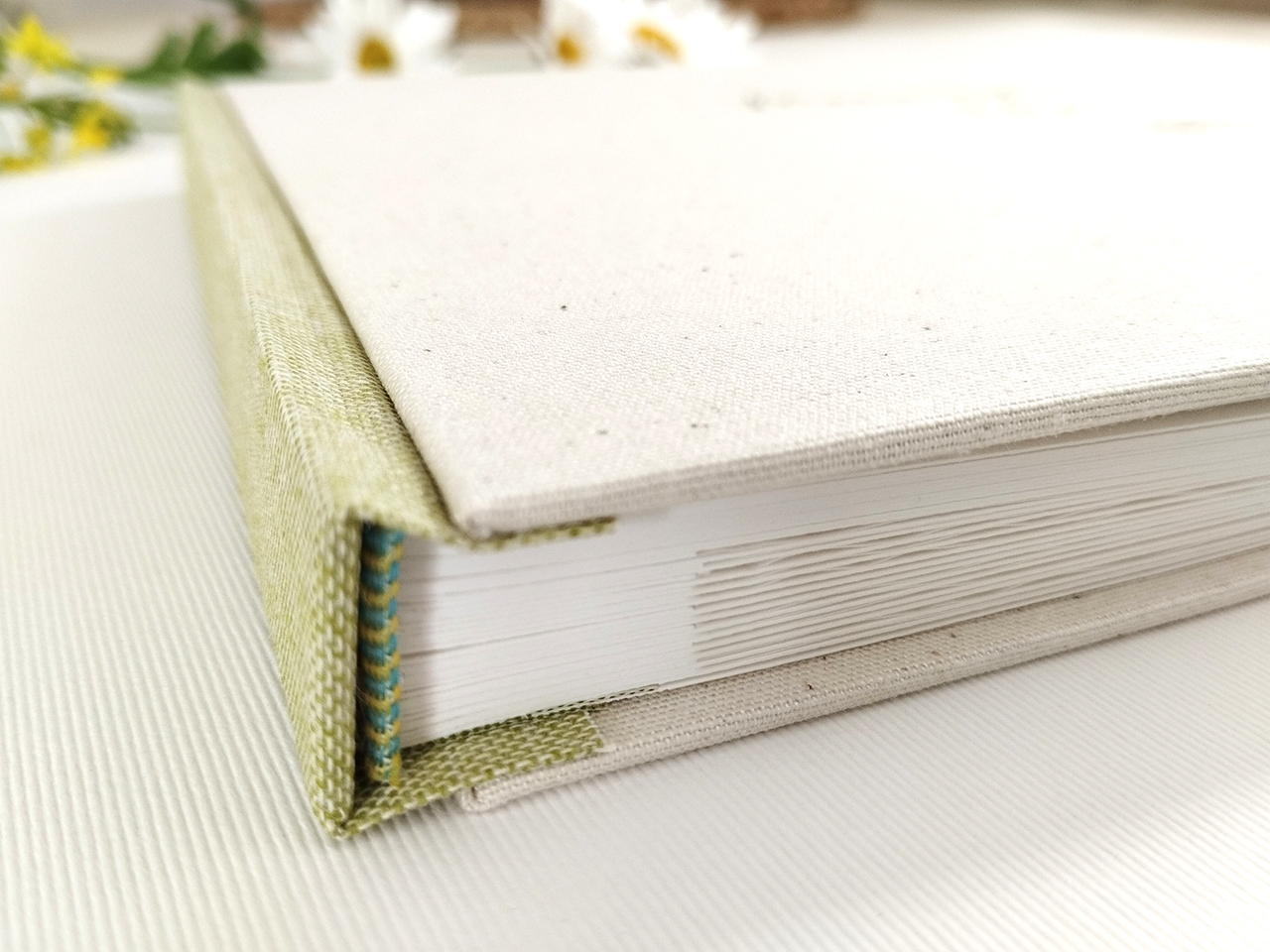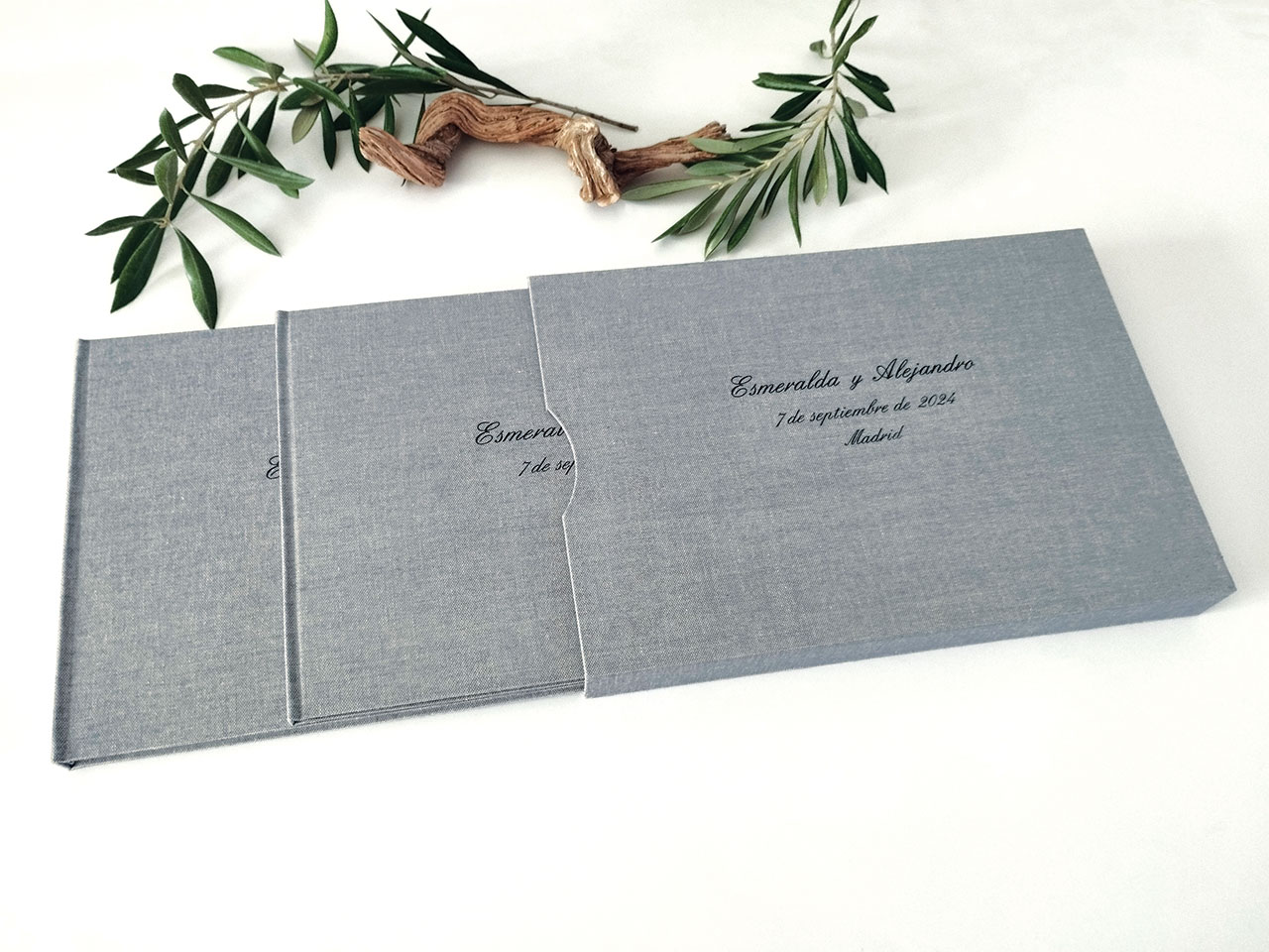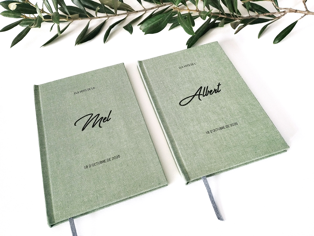 En general utilizamos tela de encuadernación de colores pasteles y suaves, y también de lino, que brindan mayor calidez y elegancia.