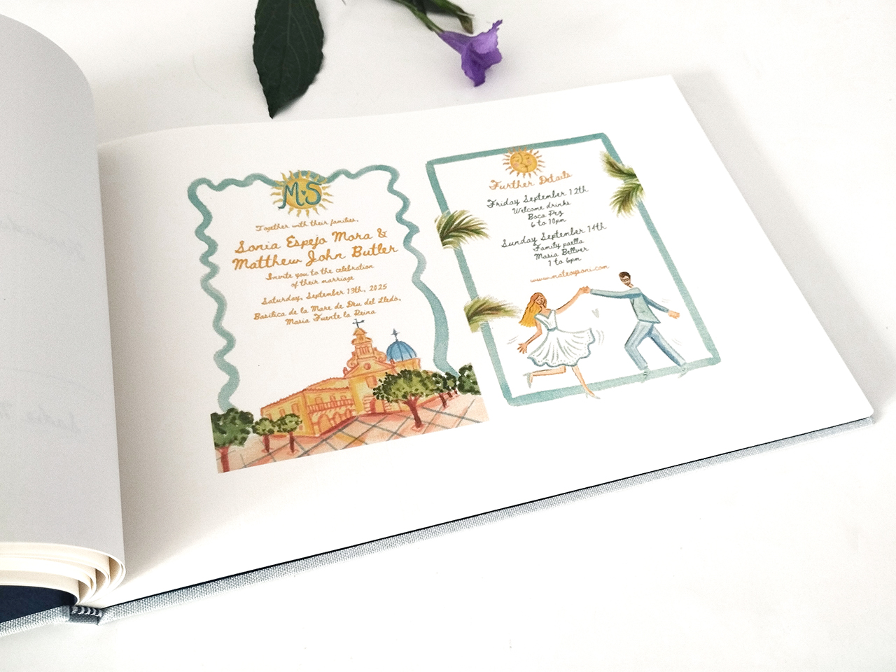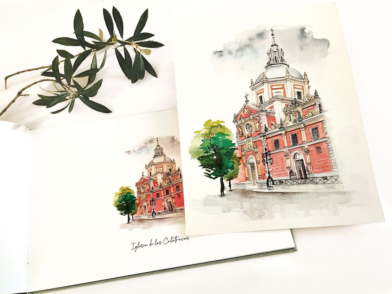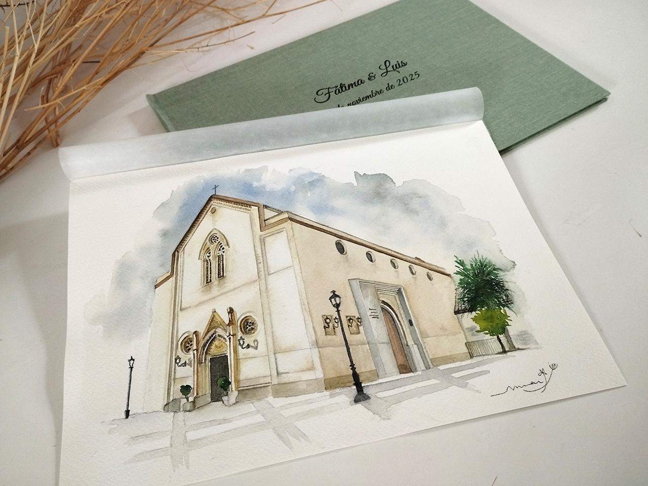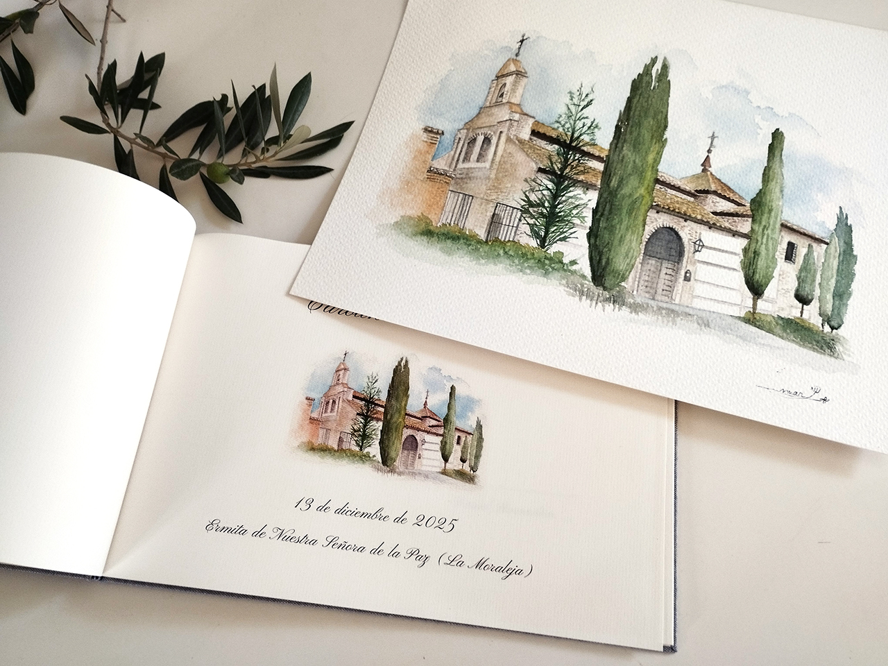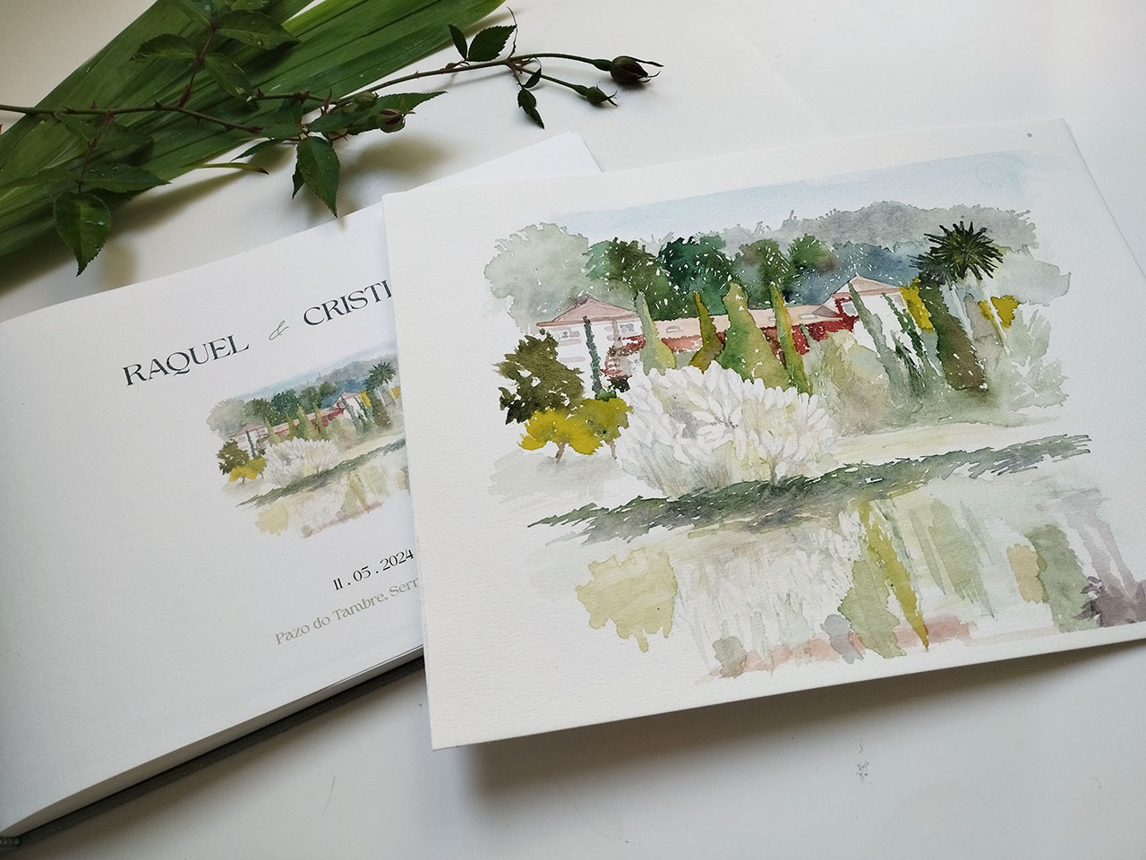 Te entregamos la acuarela original en formato A4 y la digitalizamos e imprimimos en tu libro de testigos.