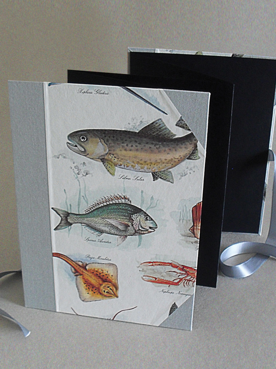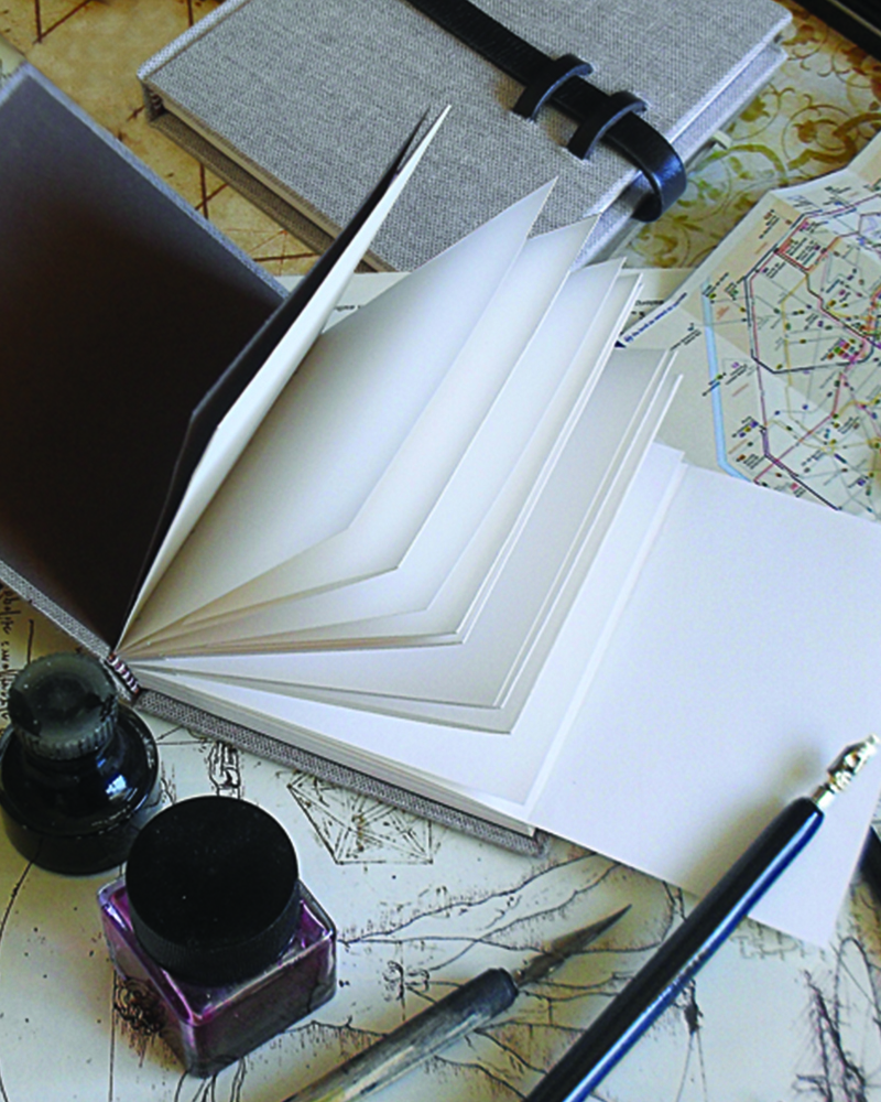 Nuestros trabajos están hechos, cosidos y encuadernados completamente a mano. Usamos materiales de gran calidad, resistentes y durables. Las cubiertas de cartón gris van forradas con tela para encuadernación, en otros diseños también papeles decorativos impresos y también hechos artesanalmente en nuestro taller, como los estampados y el «papel de agua» usado en las libretas marmoladas.